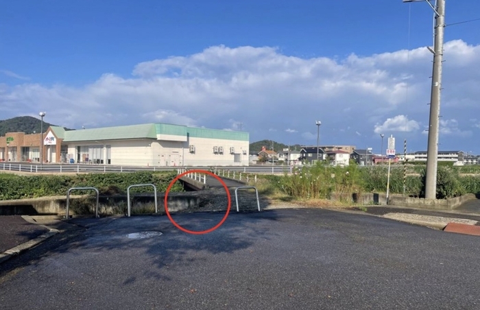 《画像:車止めが盗まれた現場(赤線で囲まれた場所が車止めがあった場所、上越市提供)》