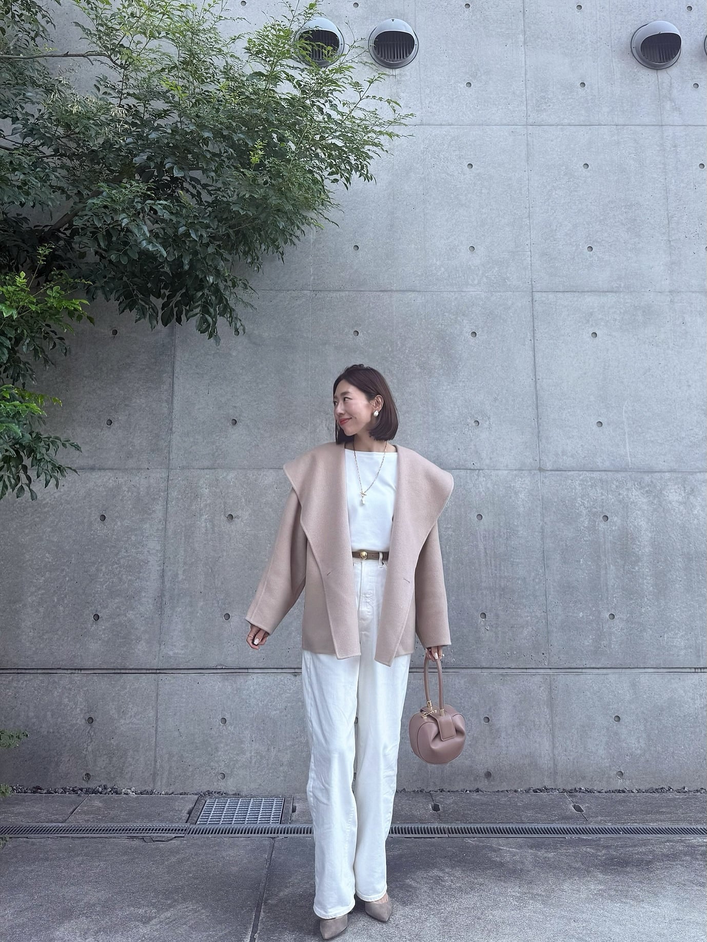 アウターや靴、バッグなどの小物もキャメルやベージュで統一すれば、黒を使わなくてもまとまり感が生まれ、難しそうに見える白コーデもぐっと取り入れやすくなります。