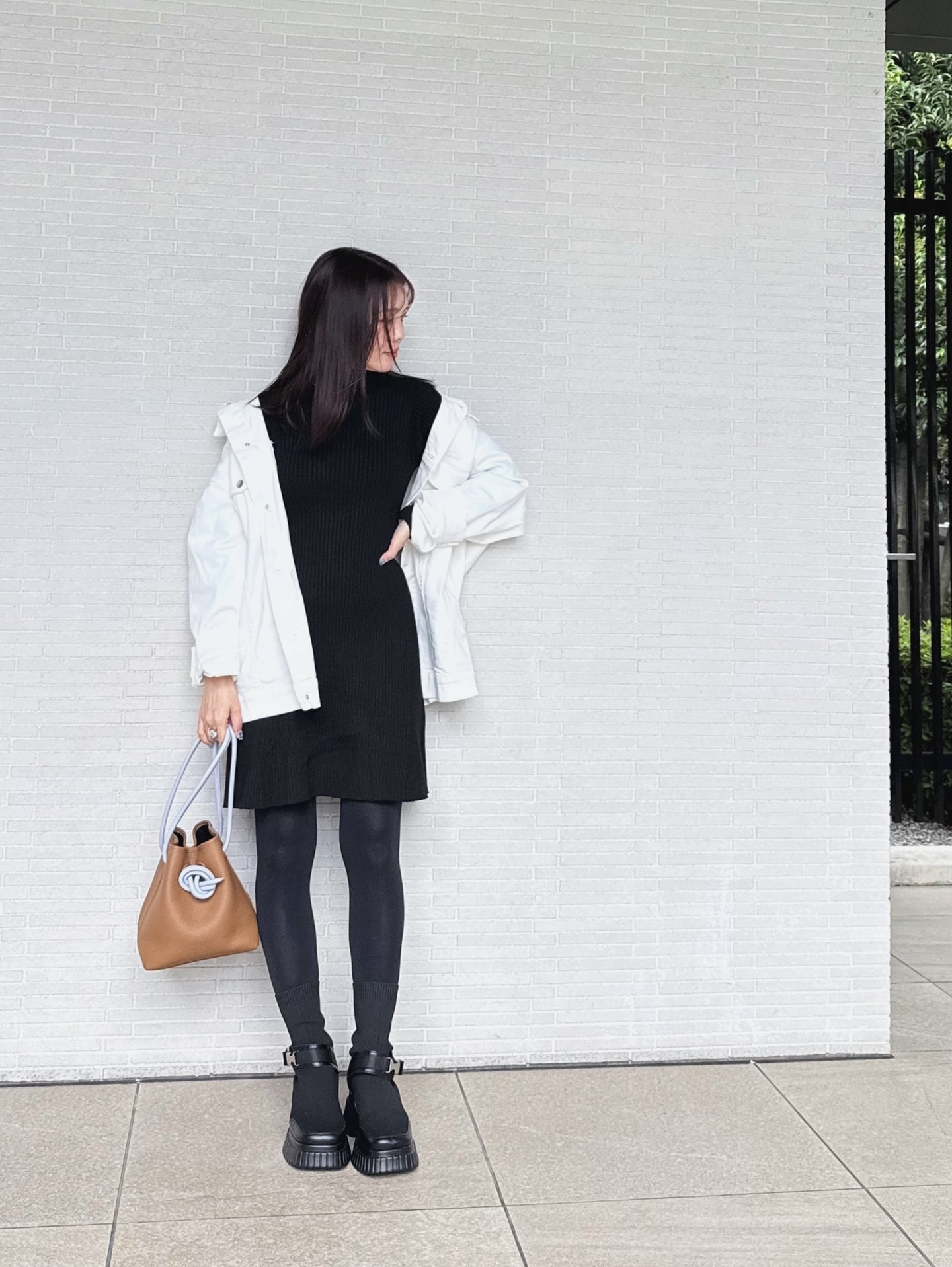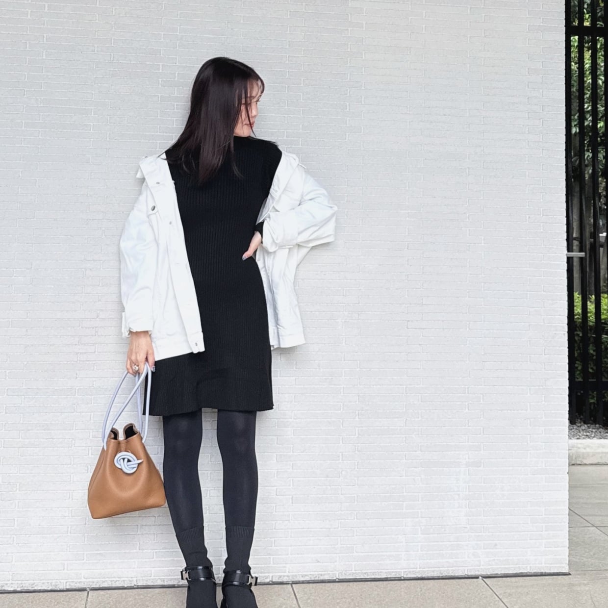 全身ブラックに白のアウターを一枚羽織るだけで、簡単なのに一気に洗練された印象がつくれます。