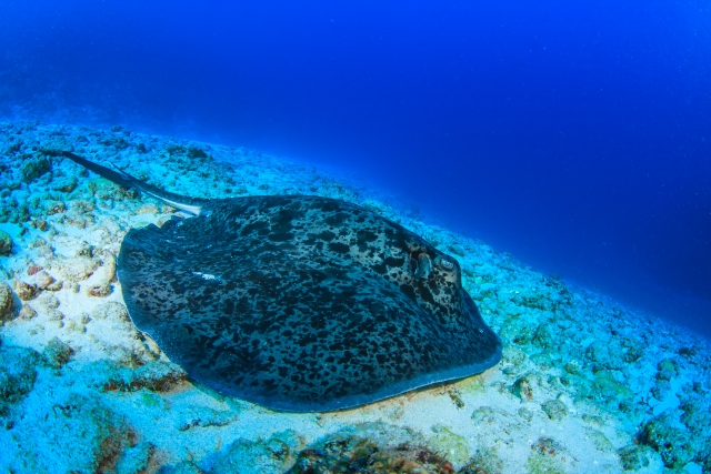 広い背中にまだら模様を散らし、ゆったりと海底を泳ぐ「マダラエイ」。同種は全長2メートルを超す大型種で、水中での圧倒的な存在感はまさに“海底の王者”といえるでしょう。