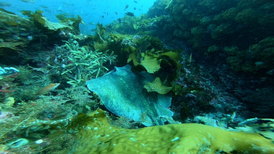 特に、潮の流れがよく栄養豊富な海底や、沖の根と呼ばれる岩場ではマダラエイの遭遇率が高く、ダイバーが憧れるスポットのひとつです。海底にじっと身を沈めていた個体が、ふわりと砂を巻き上げながら舞い上がる瞬間は、巨大な鳥が大きな翼を広げて飛び立つかのよう。