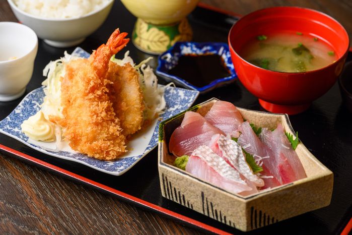 新鮮な刺身と揚げたてフライが両方楽しめる、ボリューム満点の定食。美味しい魚を思う存分満喫できます。