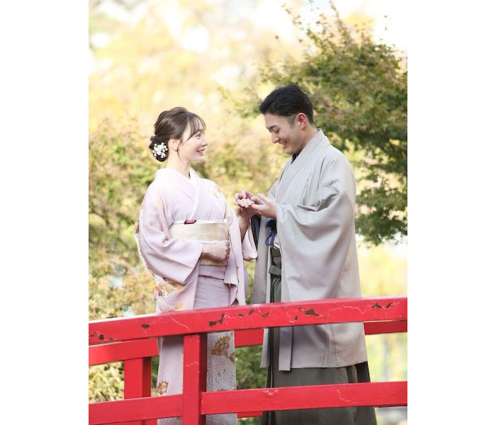 能條愛未は同日の婚約会見の様子や和装でのフォトショット、さらに連名の結婚報告文書を投稿。 金屏風を背にした会見の写真では、和装姿の二人が晴れやかな笑顔で並んでいる。中村橋之助がマイクを持ち、能條愛未が隣で微笑む様子の写真。また屋外で撮影された写真には、紅葉が色づく赤い橋の上で、同じく和装の二人が見つめ合う姿が。