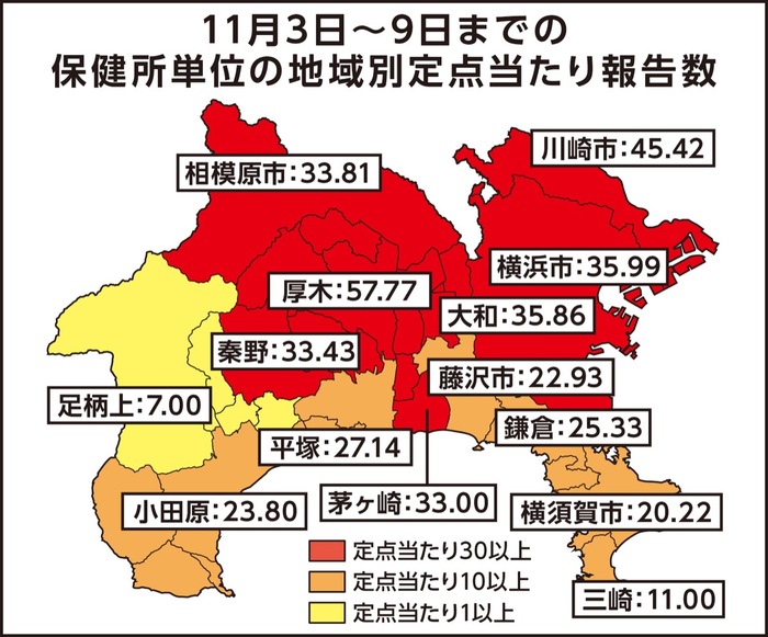 神奈川県衛生研究所の発表によると、県内では第43週(10月20日〜26日)に定点当たり報告数が注意報基準の10を超えて11・88となり、昨シーズンより2カ月ほど早く流行が始まった。