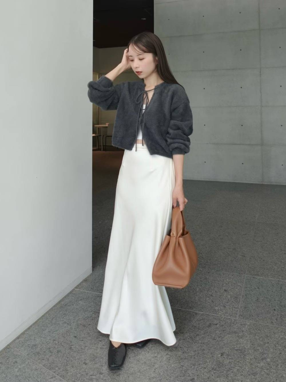チャコールグレーのシャギーカーディガンに白のサテン素材のスカートを合わせれば、濃淡や素材感の差を楽しめて、センスのよさをアピールできること間違いなし♡