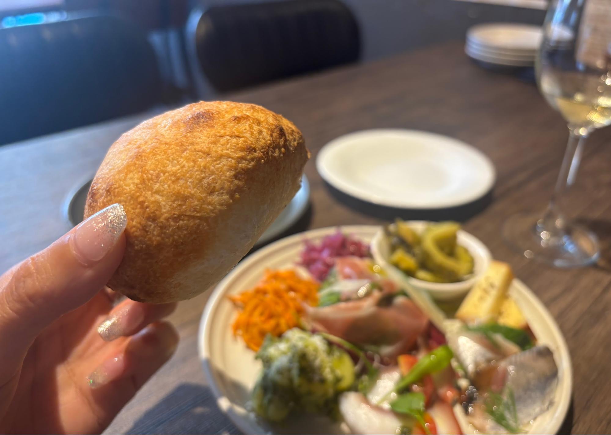 焼き立てパンは北海道産の「春よ恋」の小麦粉を使用。外はカリッと、中はもちっと、おいしいパンをいただけます。色とりどりの前菜と焼き立てパンをカリッといただきながら、白ワインを一口。まさに大人の至福のひと時です。