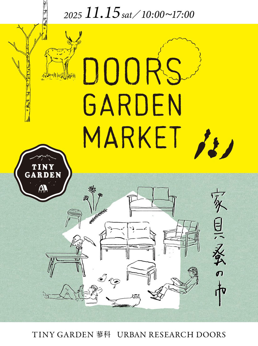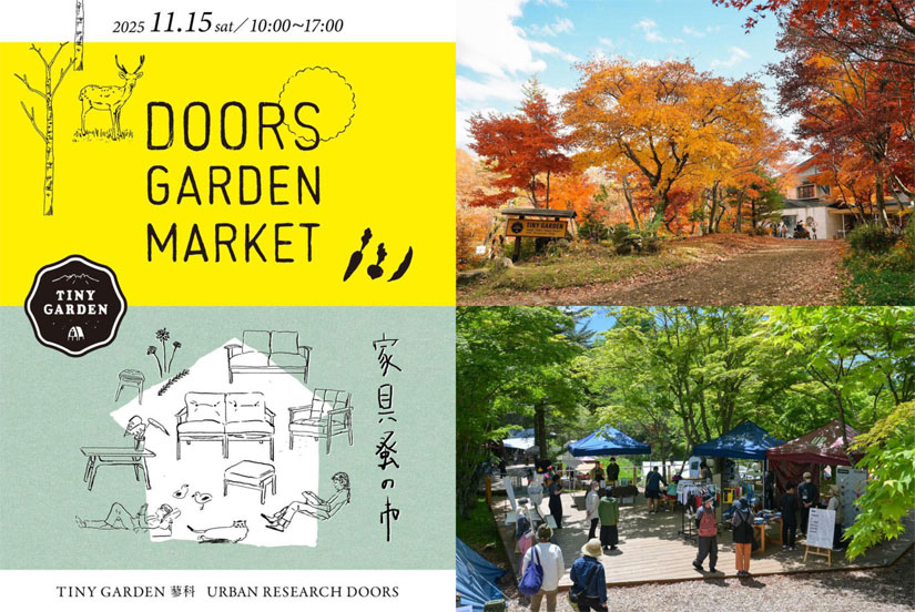 2025年11月15日(土)に長野県茅野市の「TINY GARDEN 蓼科 URBAN RESEARCH DOORS」で『DOORS GARDEN MARKET(ドアーズ ガーデン マーケット)』が開催。秋のキャンプシーズンの締めくくりとして、森と暮らしの循環をテーマにした自然体験ができるワークショップ、半径30km圏内の生産者を集めたマーケット、「URBAN RESEARCH DOORS」の家具や「EKAL」の衣類・雑貨が特価で買える蚤の市、そして、普段は宿泊者限定のキャンプ場を1日限定で開放し、夕方のキャンプファイヤーまで過ごせます。また、蓼科の「EMMA’s FOOD&GROCERY」をゲストに迎え、1日限りの先着80食限定の特別ランチも。子どもから大人まで秋が深まる蓼科の自然の時間を楽しめます。