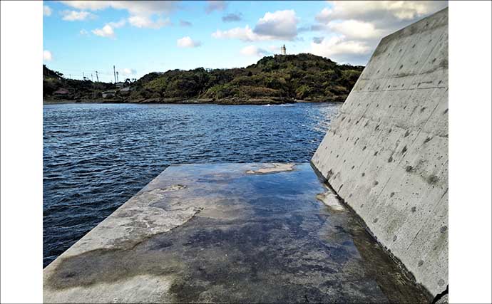 到着すると、南西風が強くウネリが入っている。こんな時は危険な磯は避けて、安全な洲崎北港で竿を出してみることにする。