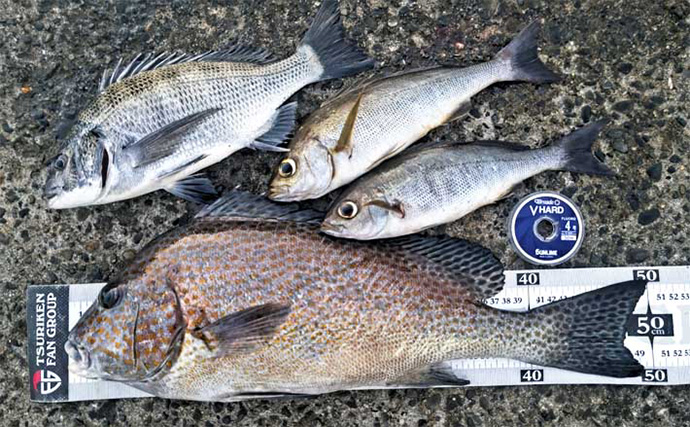 小気味いい引きで現れたのは32cmクロダイ。まきエサが効いてきたことを確信して、同じパターンで粘ってみる。しかし、反応はなく沈黙の時間が続く。