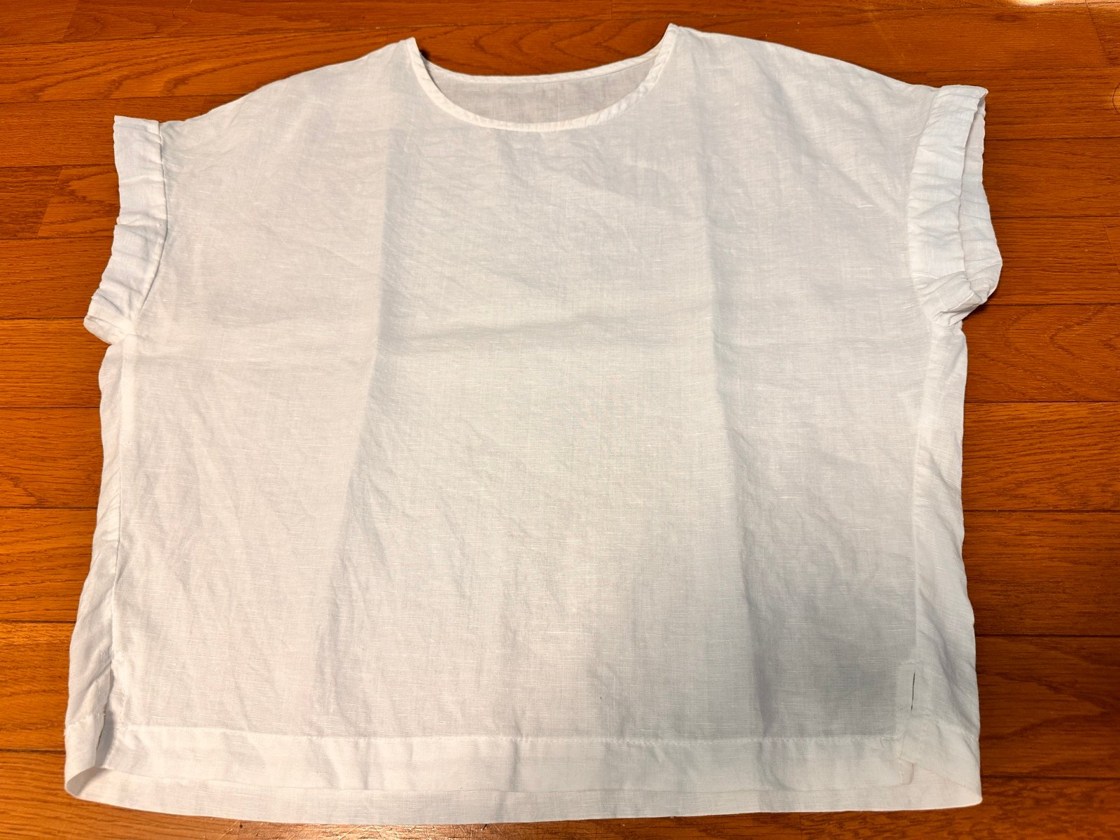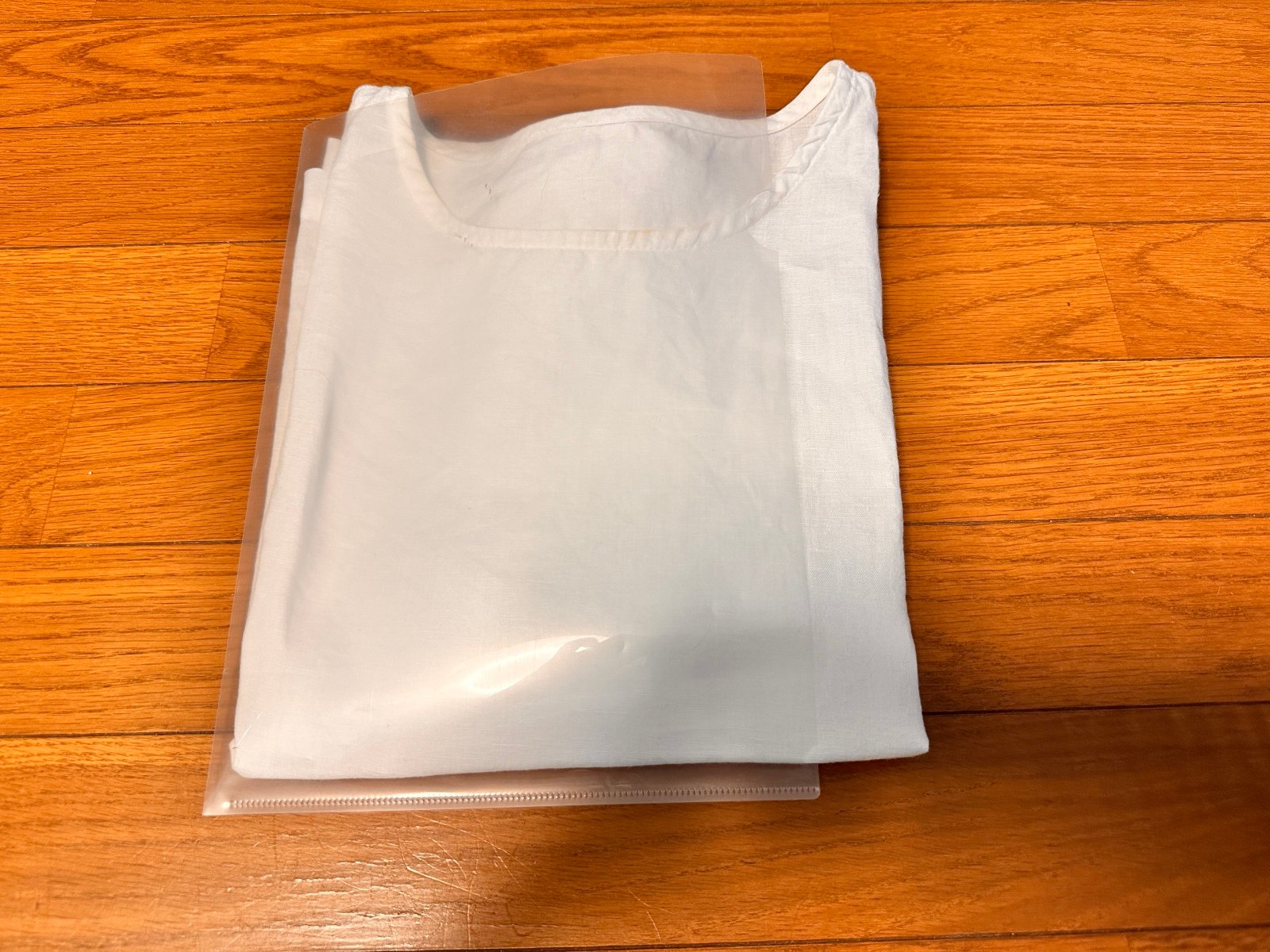 1枚目のクリアファイルで左側から挟み、2枚目のクリアファイルで右側から挟んだ状態です。こうすることで、ブラウスがしっかり固定されました。男性用のワイシャツを挟むには小さいかもしれませんが、女性用のブラウスやシャツであれば、十分に挟んで固定できます。