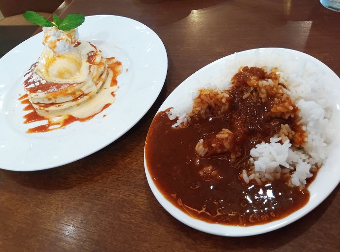 これを駆使したら1000円でも、食後のキャラメルハニーパンケーキだろうが、もう1品のポテトフライだろうが注文可能。ちなみに、カレーソースは1つをガーリックソースにすると、ピリ辛さと欧風感が増すから試してみてくれ」