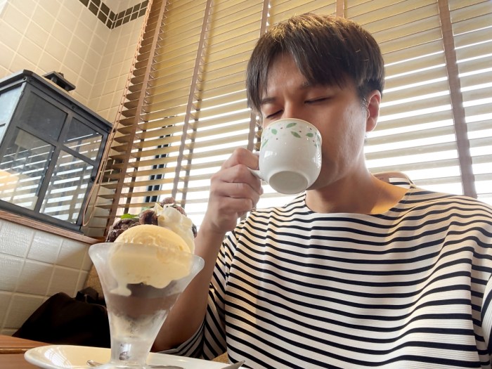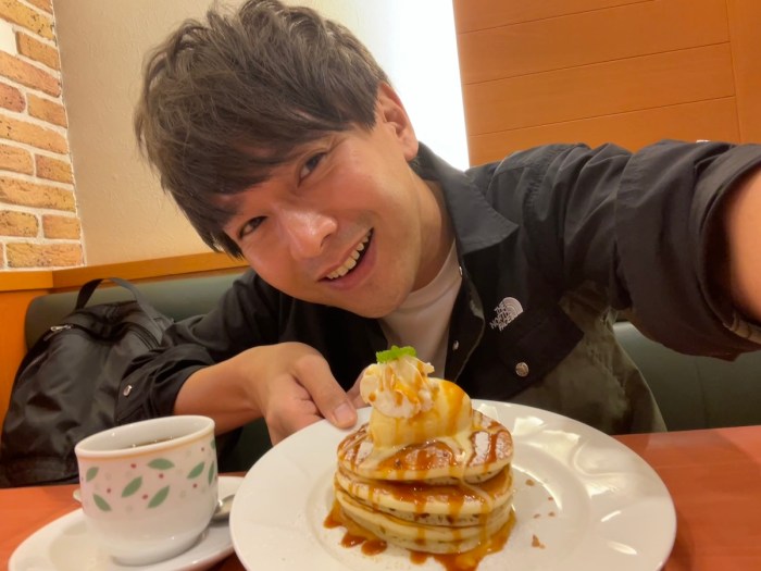 スイーツの中でもひと際存在感を放つパンケーキとホットコーヒーをオーダー。なんとなく選んだパンケーキだったが、私の舌に合いすぎてとても感動している。ふわふわアツアツの柔らかい生地に、溶けたバニラアイスが滴って超最高。
