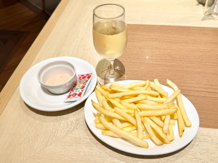 一方、デニーズのワインもサイゼと比べると高いが、程よい酸味と風味豊かな味わいで美味しい。これが「たらマヨソース」のポテトにめちゃくちゃ合うのよ。酒が進むとはこういうことか。ぜひ試してみてください」