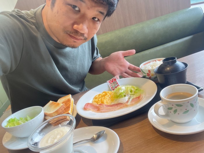 ライトモーニングを和食にして単品のパンを合わせるのがミソで、ドリンクバーやヨーグルトも付いてくる。金額を計算して990円だと知った瞬間に勝ちを確信した」