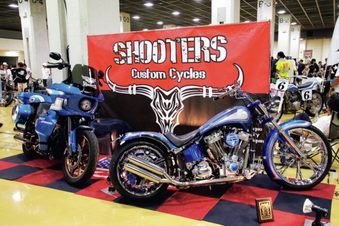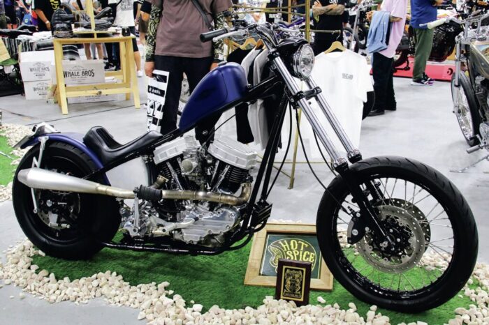 神戸のチョッパー好きから支持を集める「シウン クラフトワークス」。今回のショーでは同店がこれまで製作してきたオールドスクールやロングフォーク、フリスコなどさまざまな車両を計14台(!!)展示。一台一台仕様の異なるチョッパーは多くの目をひいた。