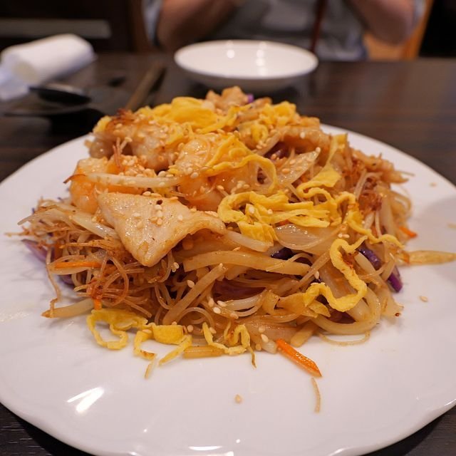 で、先にCセットの「海老入りカレー焼きビーフン」が登場。フロア担当の奥様から「シェアされます?」と確認され、すっと小皿が登場。香港料理店なので焼きそばにするか、めっちゃ悩んだのですが、カレーの魅力に抗えず。