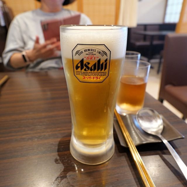 で、まずはランチに付いてくる冷たいお茶(中国緑茶ですが、蓮茶のような滑らかな口当たりで美味しい)がでてきて、私は追加でこちらの冷え冷えビールも頂いてニッコリ。