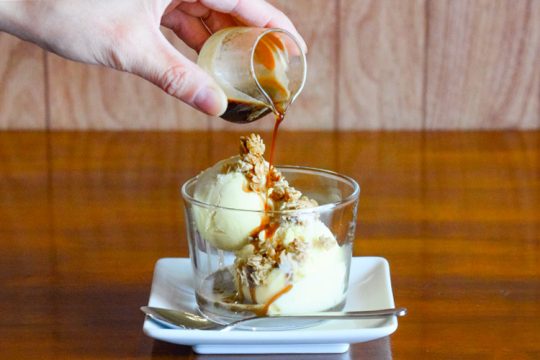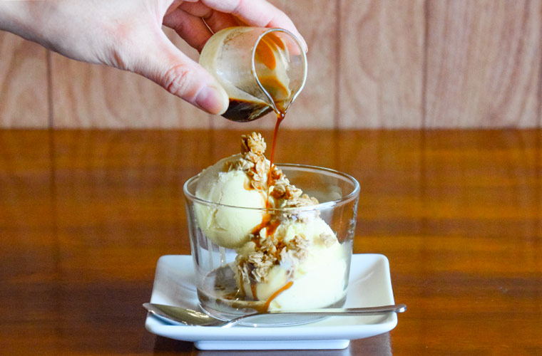 コーヒーに合うスイーツも全て手作り。定番の『アフォガート』は、濃厚なバニラアイスクリームに、抽出したてのエスプレッソをかけていただきます。苦みと甘みが織りなすハーモニーが絶妙で、アイスクリームが溶け出し、カフェラテのような味わいへと変化する過程も楽しめます。シリアルのザクザクとした食感もアクセントに。