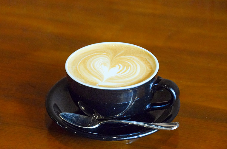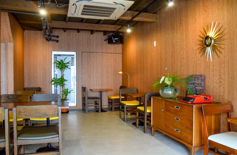 木目を基調とした落ち着いた店内。大きな窓から日が差し込み、温かみのある梁(はり)見せ天井が開放感を演出してくれます。独特なデザインの掛け時計や歴史を感じさせるタイプライターなど、ヴィンテージなアイテムも多数。レトロな趣を醸(かも)しつつモダンな雰囲気を兼ね備えた、オーナーのセンスが光る空間です。ゆったり配置された座席は満席でも目線が合わず、おひとり様で過ごすお客さんも多いとか。