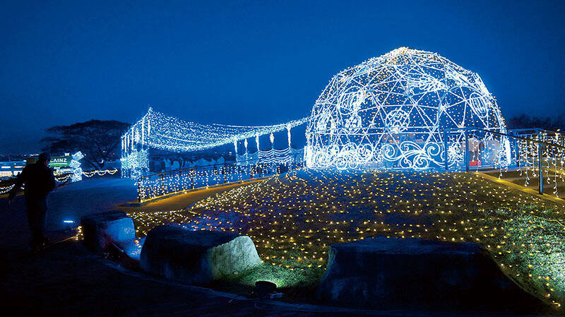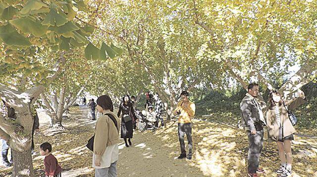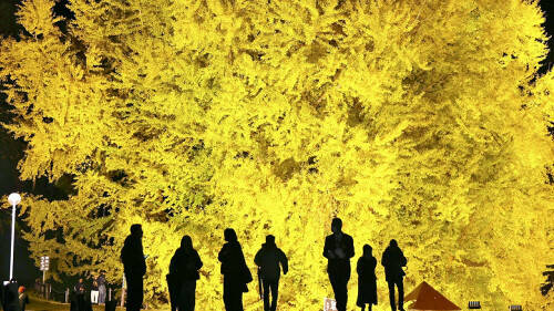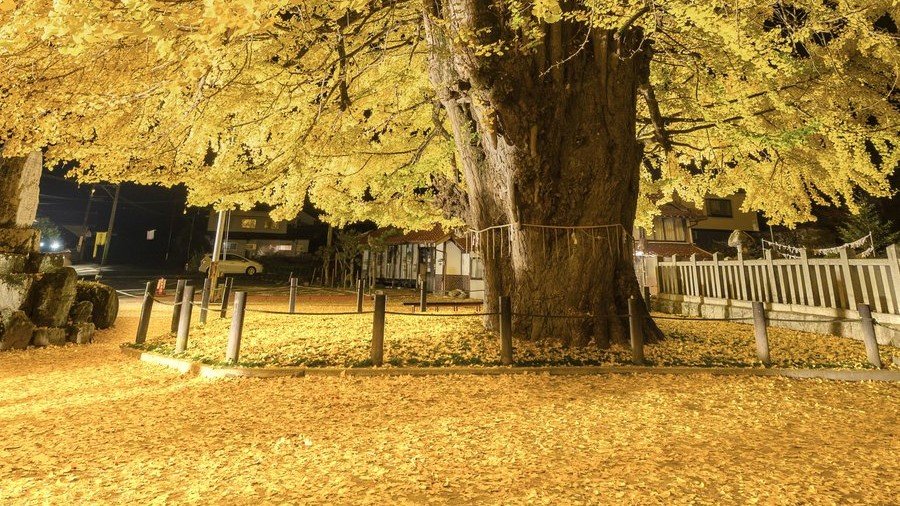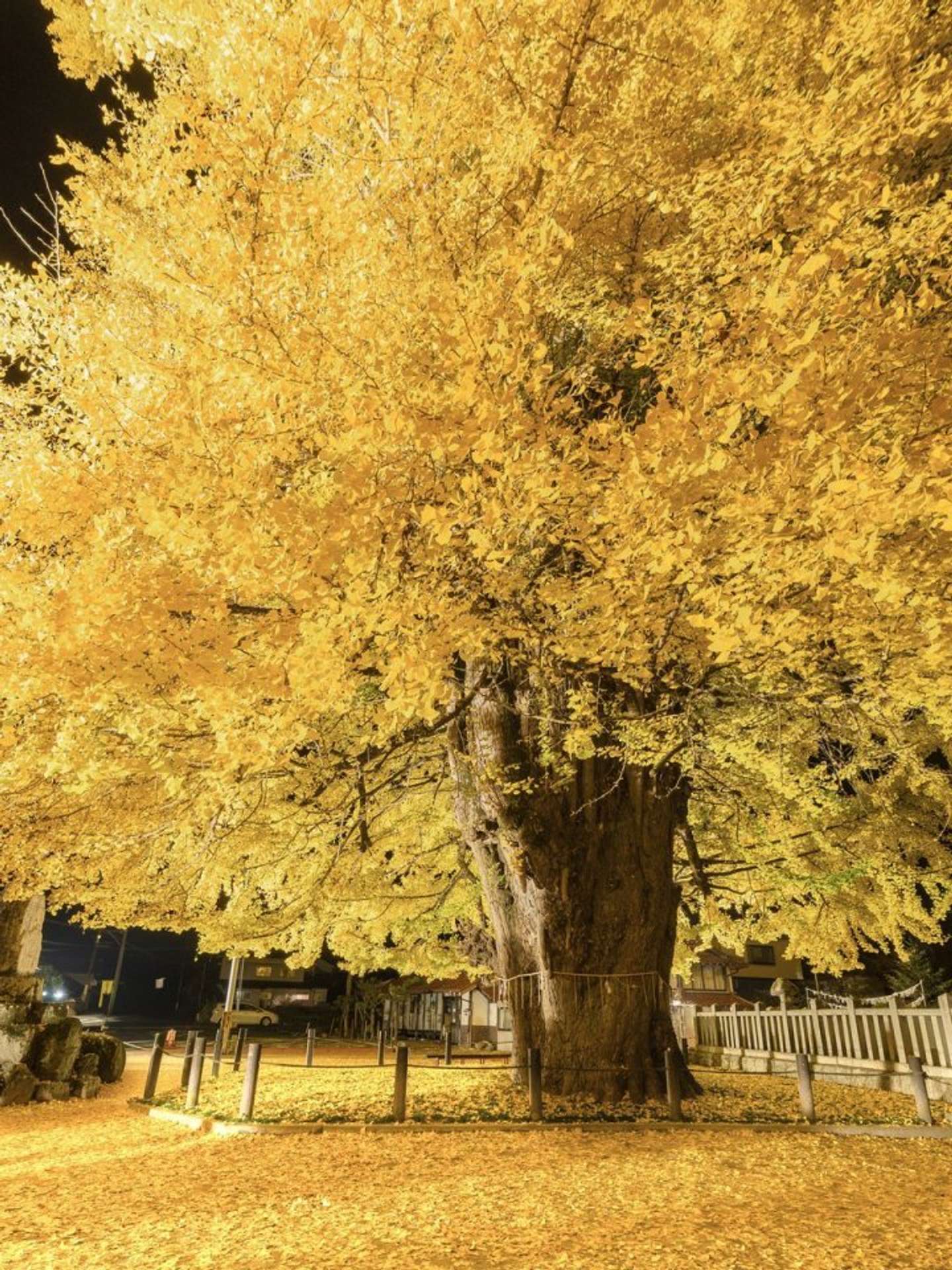 樹高49メートル、周囲8.2メートルの巨木が夜のライトアップで黄金色に輝き、地面にも黄色いじゅうたんを広げている。