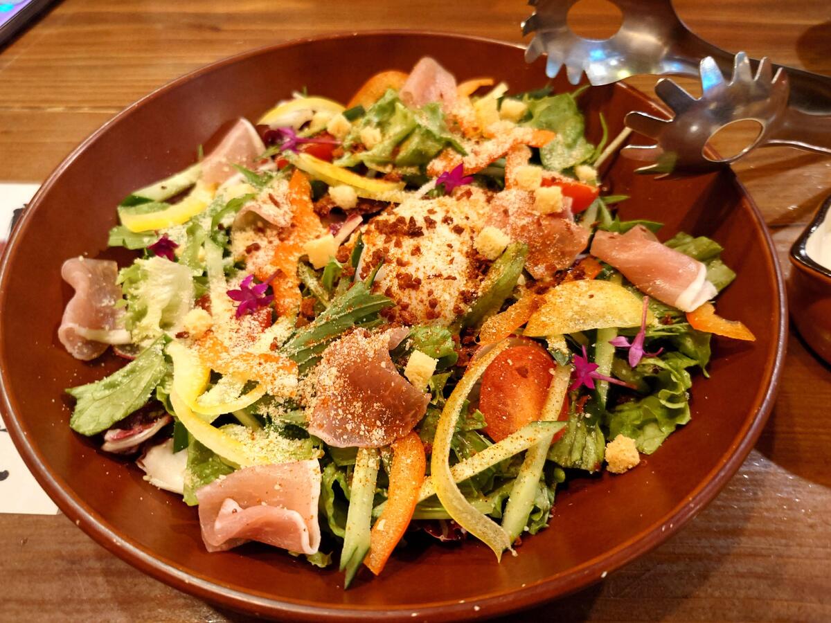 生ハムと温玉のシーザーサラダ。960円(税込1056円)。