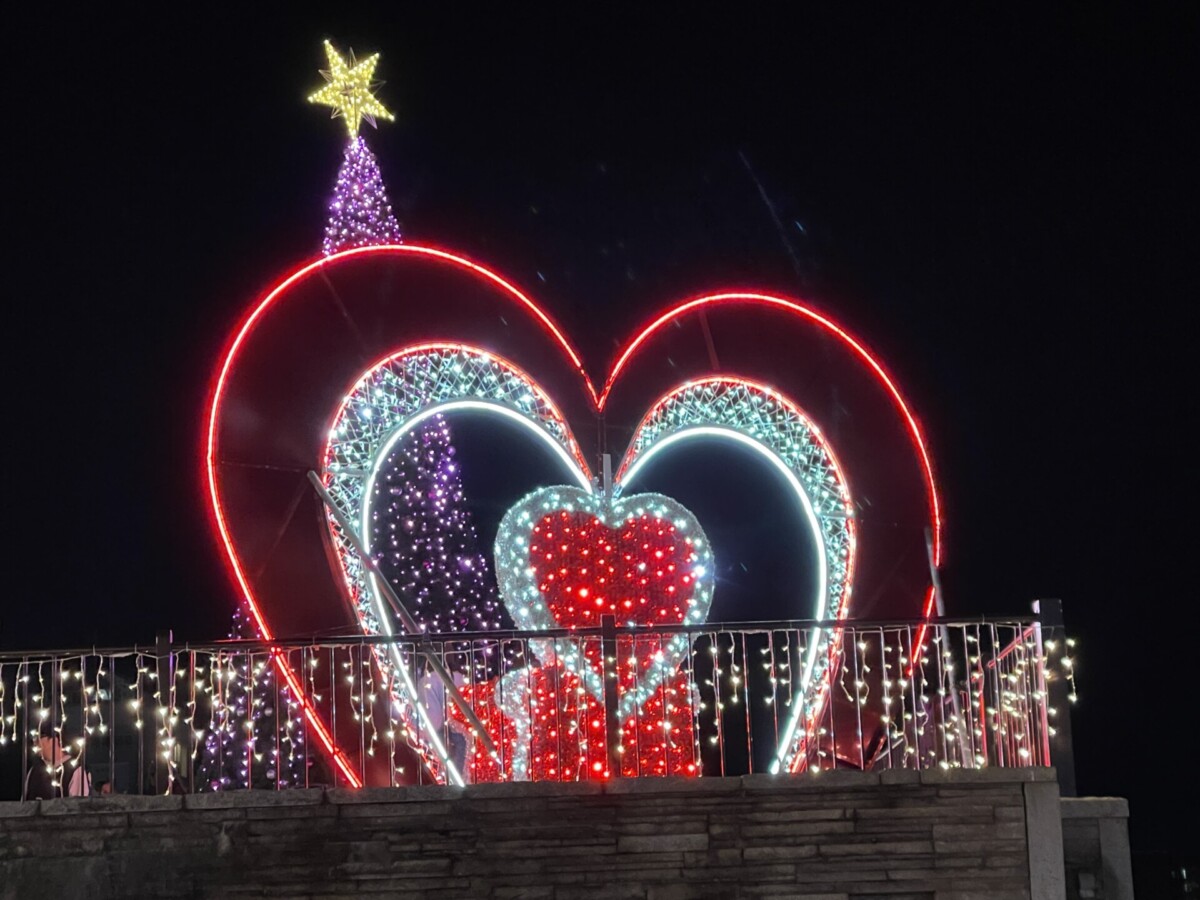 紫川親水広場ポンプ室上には、高さ4メートルの巨大ハートオブジェを設置。外橋の光を背景に、温かくロマンチックな空間を演出しています。