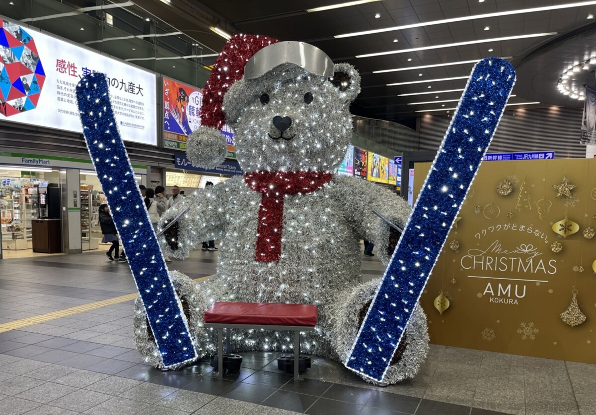 小倉駅3階ストリートピアノ周辺には、白くまが登場。サンタの帽子やスキー板を装着し、冬使用のキラキラ輝く巨大白くまです。