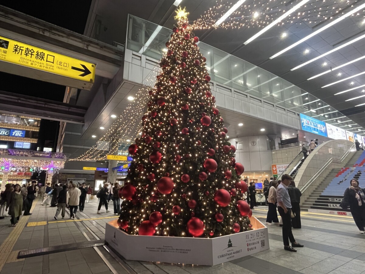 小倉駅小倉城口ペデストリアンデッキには、高さ8メートルのクリスマスツリーを設置し、約6万球のイルミネーションが周辺を輝かせています。