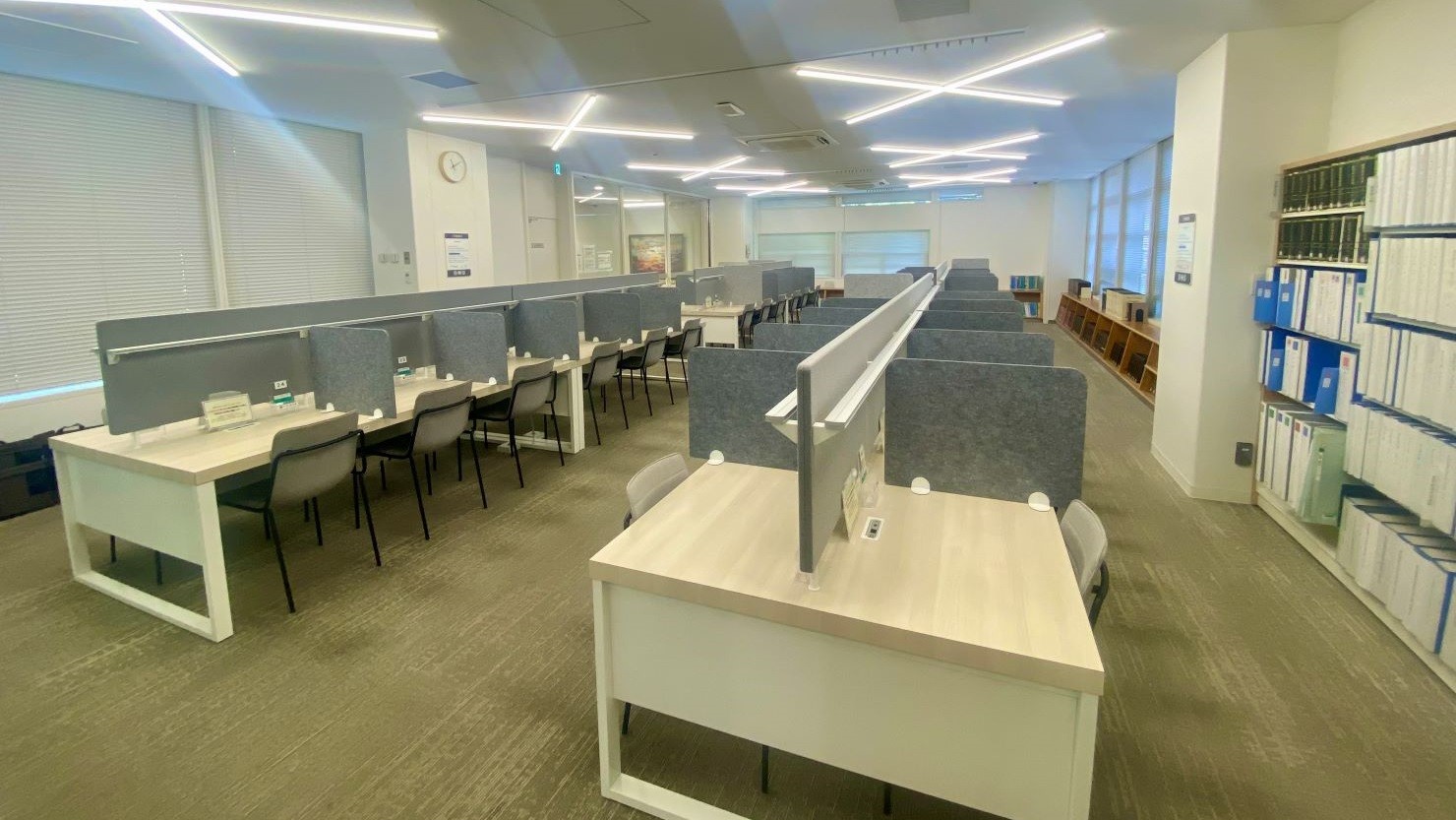 48席の椅子とデスクが並ぶ写真の部屋は「調べもの室」。図書館利用カードをお持ちの方が使用でき、館内にある端末やパソコンやスマートフォンからの予約が必要です。