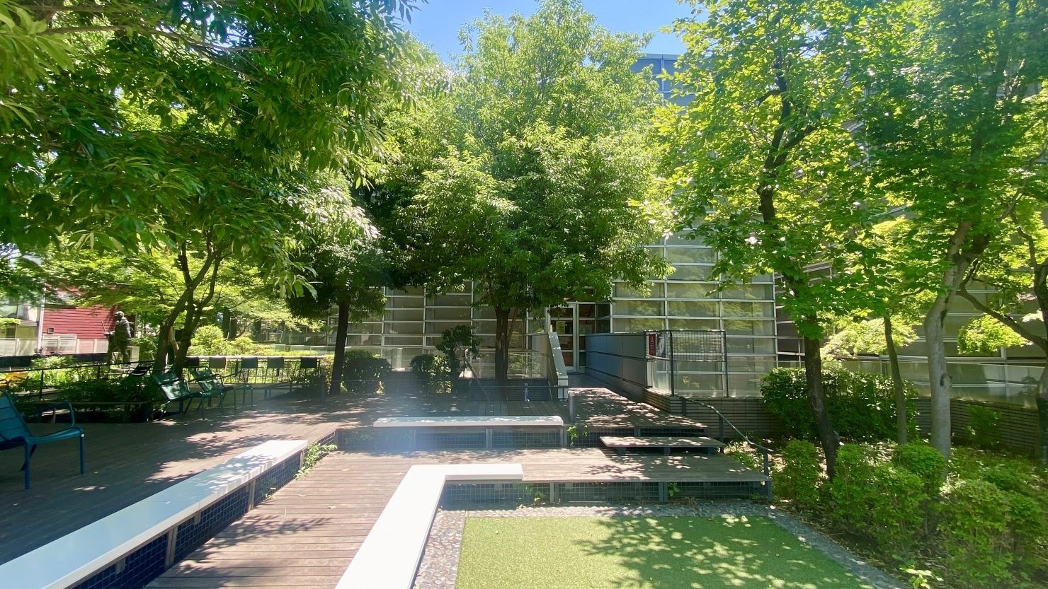 「建物の目の前に広がるこちらの『本の広場』は2020年のリニューアルオープンの際に新設されたエリアのひとつです。もともと建物の西側に生い茂っていた樹木の一部を伐採して、地形の高低差を生かした浮床のデッキを造ったのです」