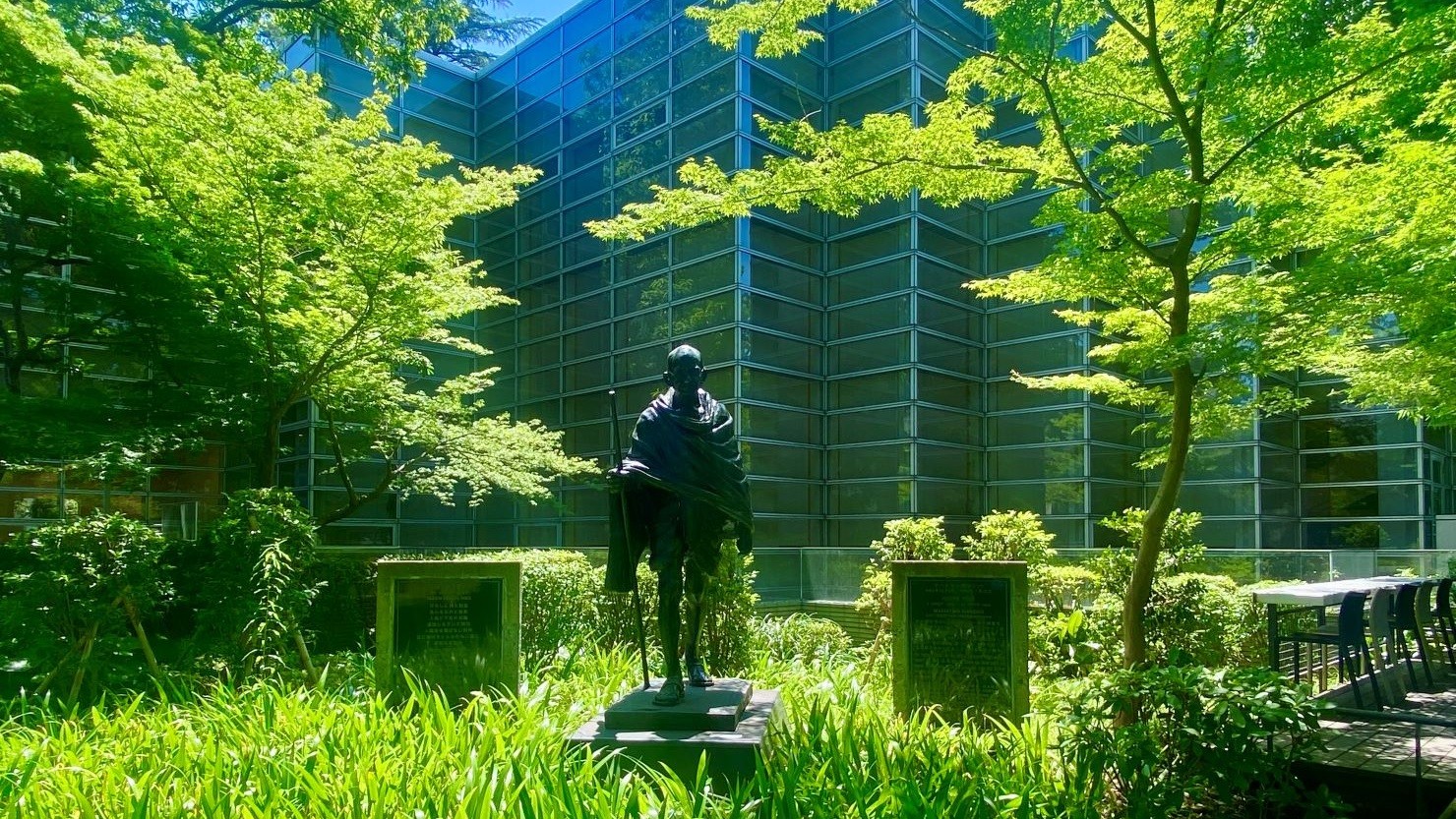 2009(平成21)年5月には、図書館敷地内の本の広場に杉並区と交流のあるインドの慈善団体から寄付された「マハトマ・ガンジー像」が設置。