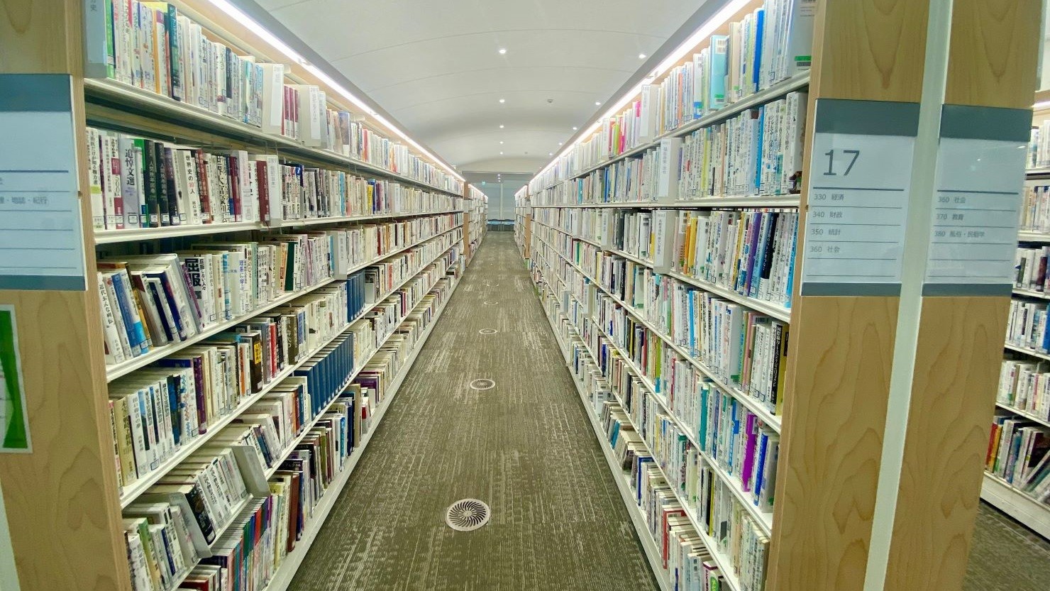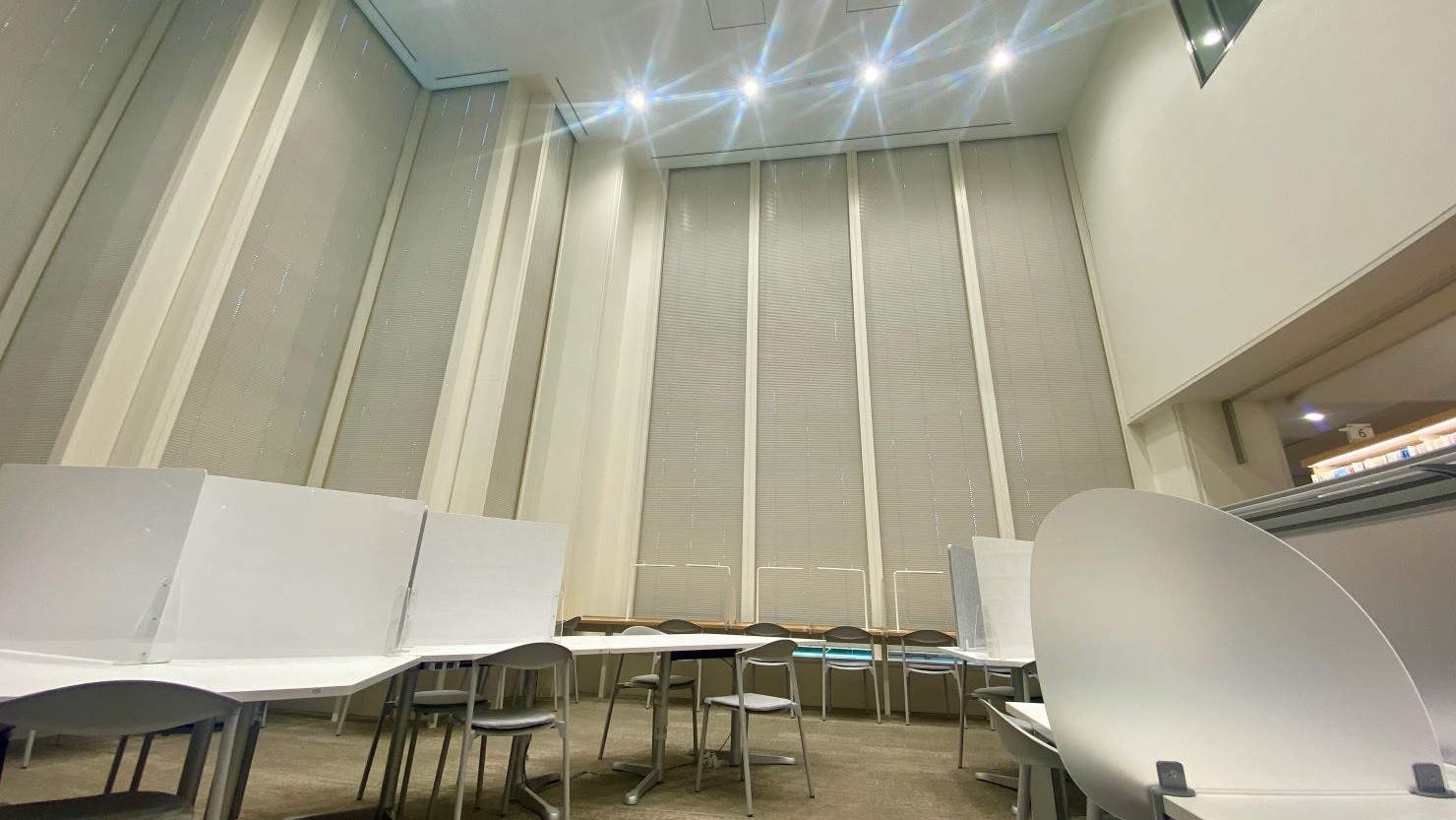 こちらは1階フロアの閲覧コーナーです。パーテーションで仕切られた長テーブルの閲覧席が並びますが、天井が吹き抜けになっているため圧迫感はありません。