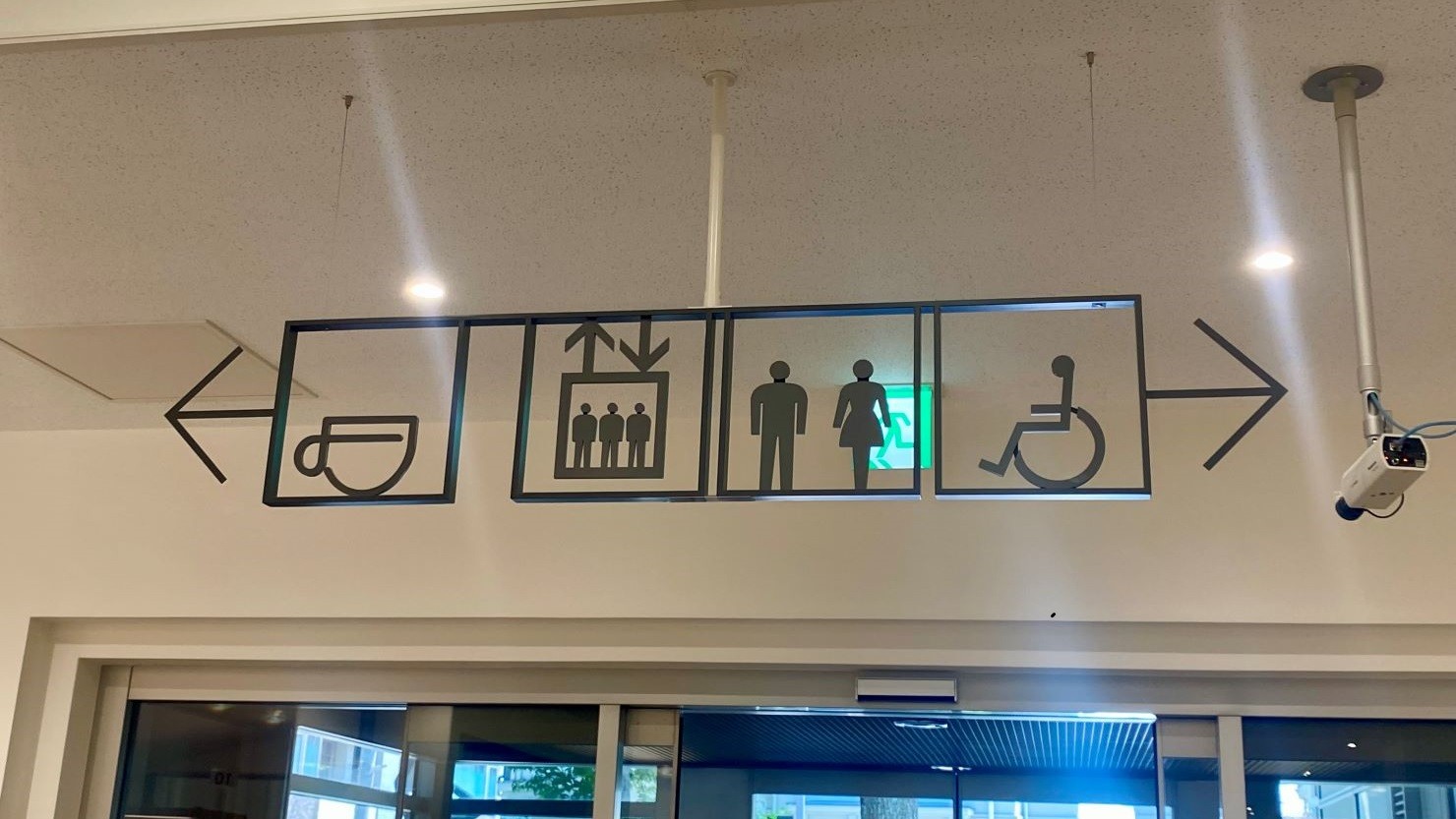 こちらは正面玄関を入ってすぐ真上に取り付けられているサインプレートです。シンプルでわかりやすいピクトグラムのプレートが、図書館の顔であるエントランスを洗練された雰囲気に演出しています。