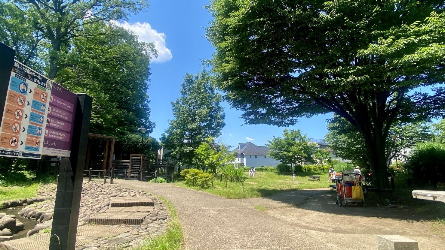 「読書の森公園」は杉並区立中央図書館と一体という新しい考えで造られた広さ1,841m2ほどの公園です。開園時間は6:00から20:00まで。遊具はありませんが、青々とした芝の広場や睡蓮の咲く池があり、東屋や小川のほとりでは読書を楽しめます。