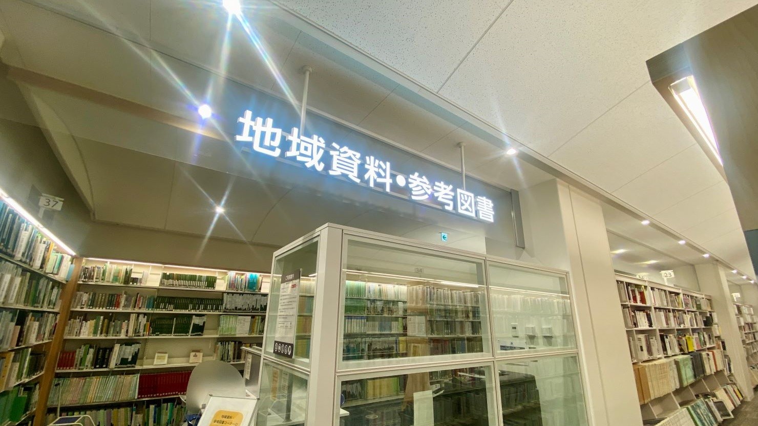 1階フロアの一角にある「地域資料・参考図書」コーナーにも電飾のサインプレートが輝いています。杉並区や東京都の地域資料をそろえたこちらのコーナーは、仕切られている空間のため調べものに没頭できます。また総合カウンターに近いため、分からないことは気軽に職員や調べもの・相談カウンターに尋ねることができて便利です。