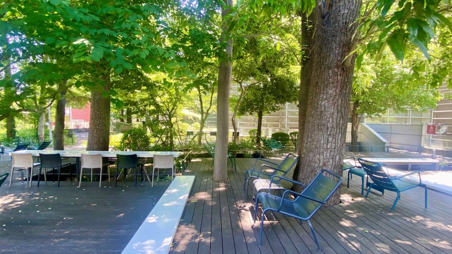 「本の広場」は森の中のオアシス。光と風を感じながら読書を満喫できます