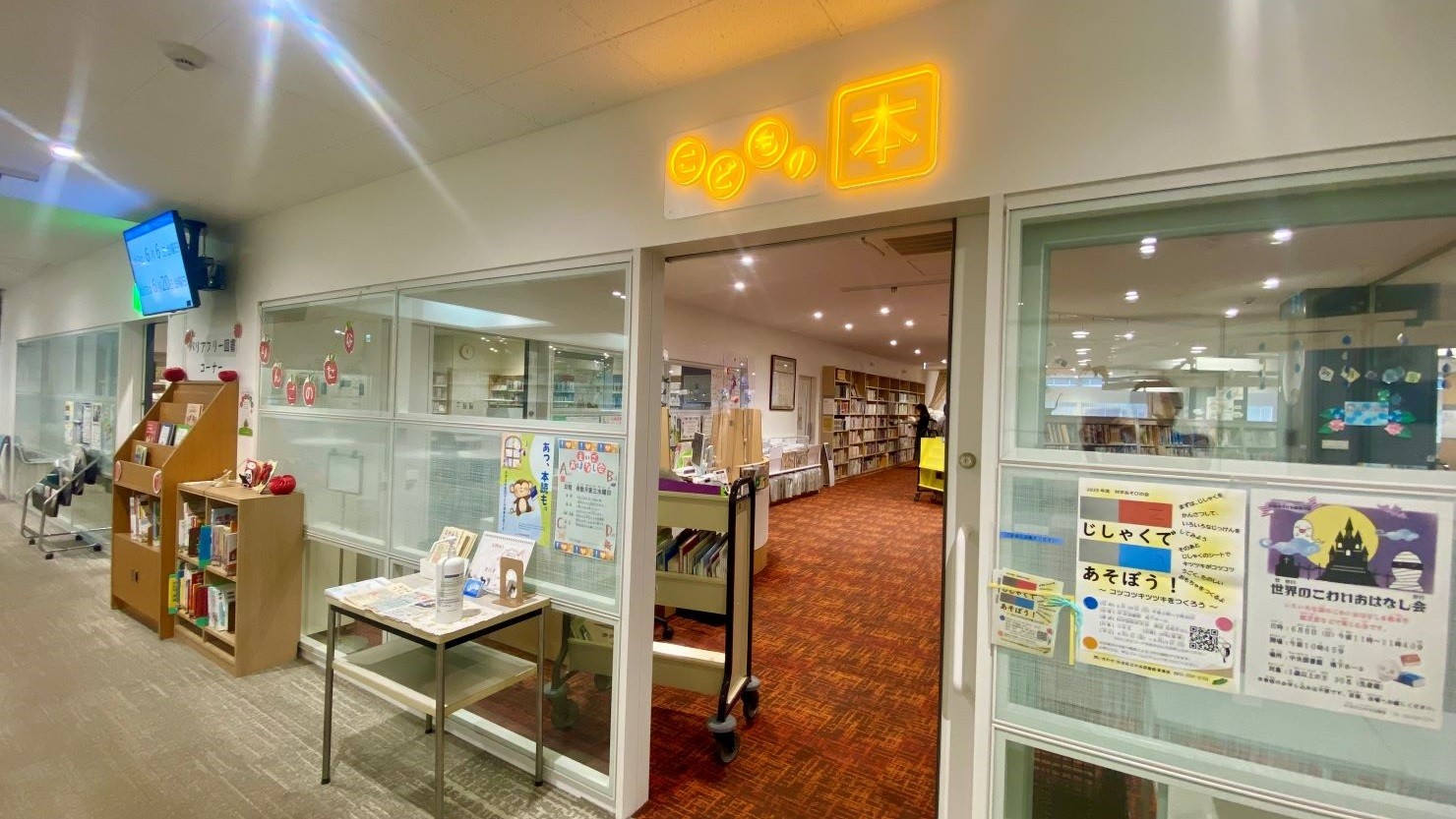 「こどもの本」コーナーの入口では、元気いっぱいの黄色のサインプレートが子どもたちを出迎えてくれます。隣接するヤングアダルトコーナーのサインプレートはフレッシュな緑の電飾で、世代ごとの特徴を象徴しているような色づかいですね。