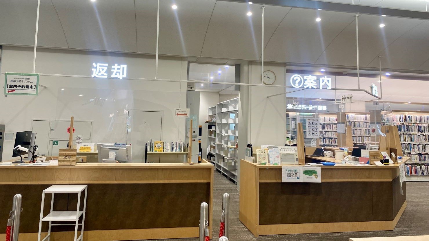 1階の総合カウンターには、電飾のサインプレートが採用されています。おしゃれなカフェバーのようで目を引きます。