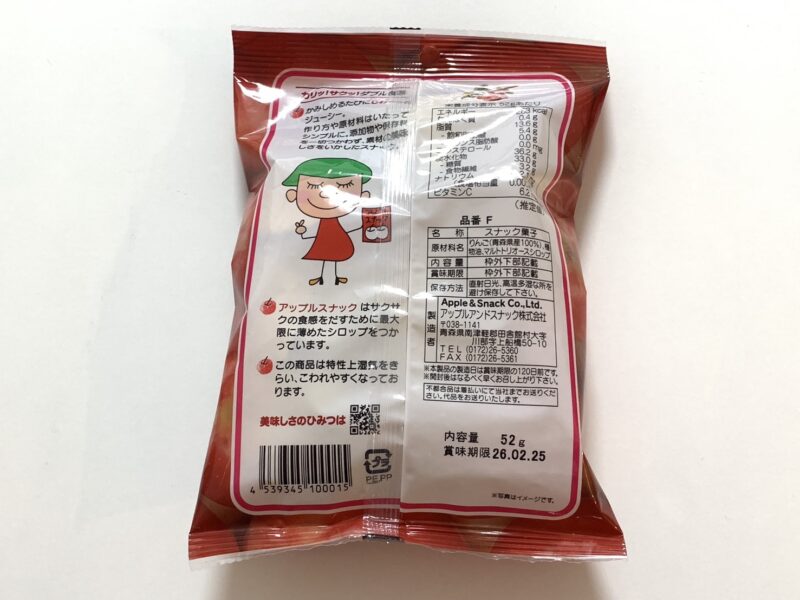 青森県産アップルスナックは、アップルアンドスナック株式会社という青森の会社がつくっています。この会社は、りんごチップスだけをつくっている会社だそうです。