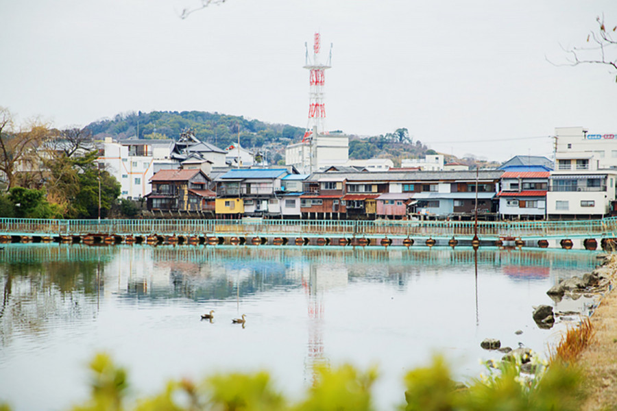 玉島図書館前の溜川にかかる、ドラム缶でできた浮橋。渡ってみたところ、しっかりとしており、ほぼ揺れませんので安心して渡ってください。1980年設置、1986年に改修され、現在も地域の生活道路の一部として活躍しています。