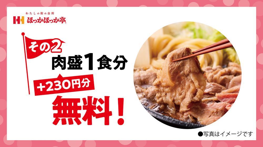 第2弾は、「牛すき焼シリーズ肉盛 1食分(+230円分)」無料。