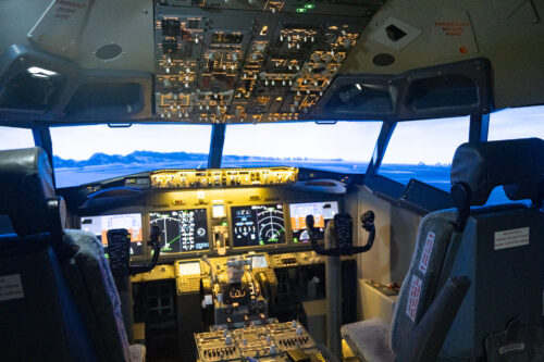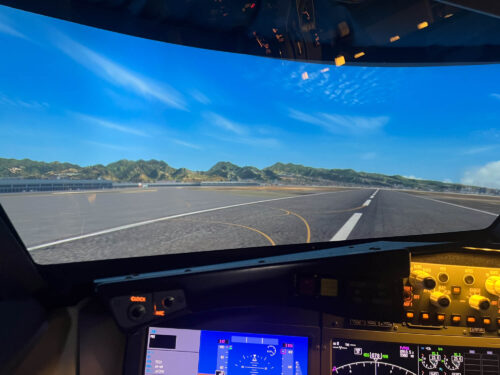 そして実物大の操縦桿を握って、フライト体験。本物の飛行機のスイッチが付いた操縦室で、リアルな操縦体験ができます。
