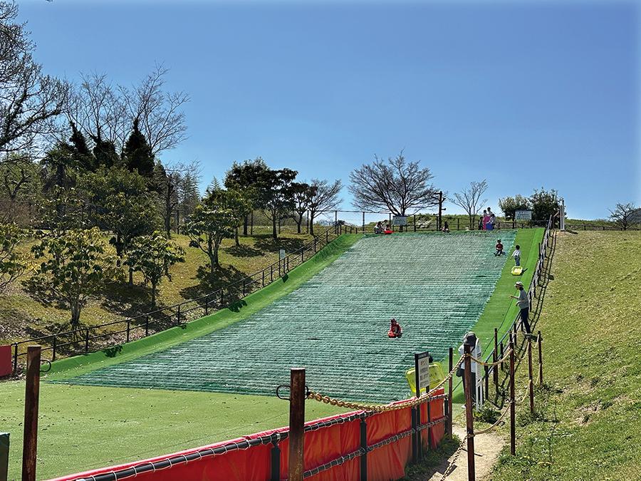 人工芝のゲレンデ「芝そり広場」も人気遊具のひとつ。そりは各自持参となりますが、山の斜面から一気に滑りおりるスリルと爽快感があります。