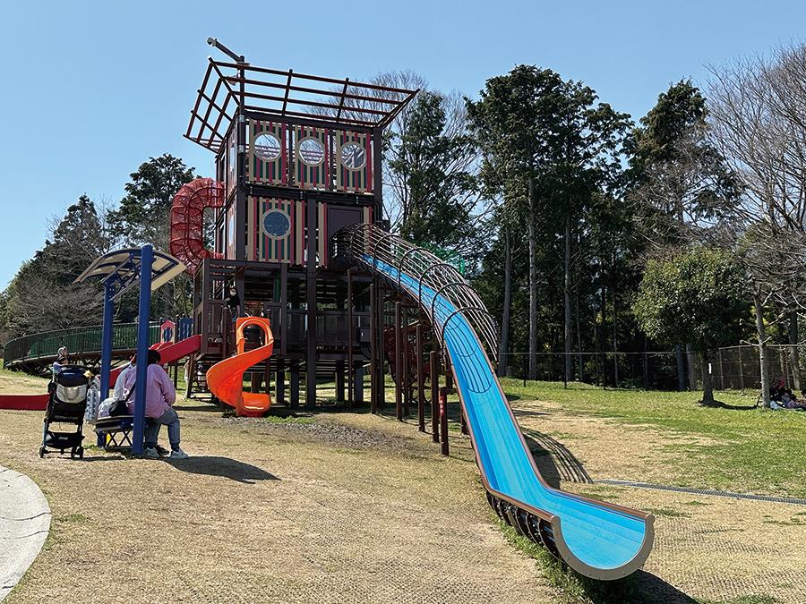 カラフルでかわいい幼児用遊具とその奥には展望台付きの大型複合遊具。ロングスライダーで颯爽と滑ったり、展望台へネットやはしごをよじ登ったりと思いきり体を動かして遊べます。 1階にもぐるぐるすべり台や幅広すべり台などがあり、小さな子どもでも楽しめます。