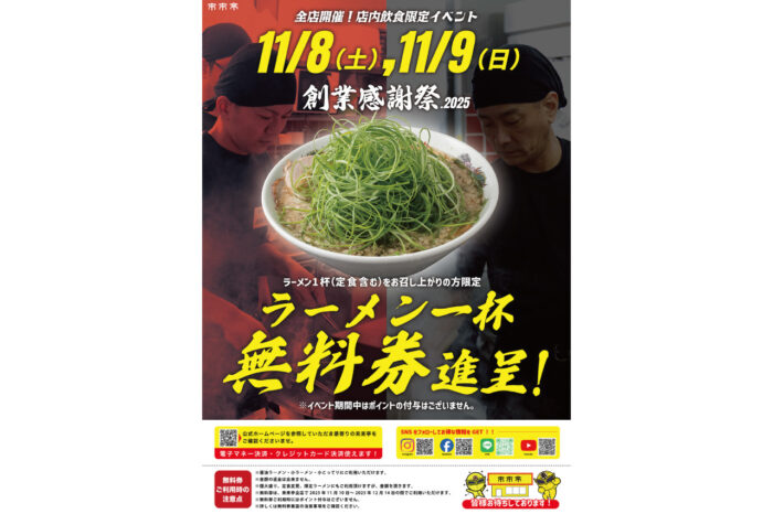 1997年、滋賀県・野洲で誕生した[来来亭]が、日頃の感謝を込めて『創業感謝祭 2025』を開催する。2025年11月8日(土)・9日(日)の2日間、全国の店舗でラーメン(定食含む)を1杯注文した人に、「ラーメン1杯無料券」が進呈される特別なイベントだ。
