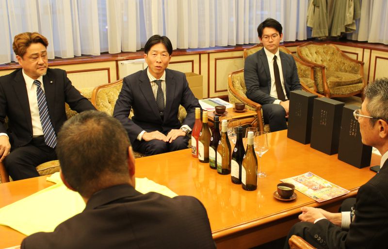 市役所を訪れたのは、「楽し市」の主催者、水沢地区社会福祉協議会の鈴木久代会長や協力している同地区連合自治会の森哲也会長らと、水沢ワイン“ドメーヌフイアージュ”を運営する株式会社i-kyo代表取締役の五十嵐和仁さんとリーダーの福中博基さん。テーブルには、今年初めて酒造免許を得て生産されたばかりのワインのボトルが並べられた。