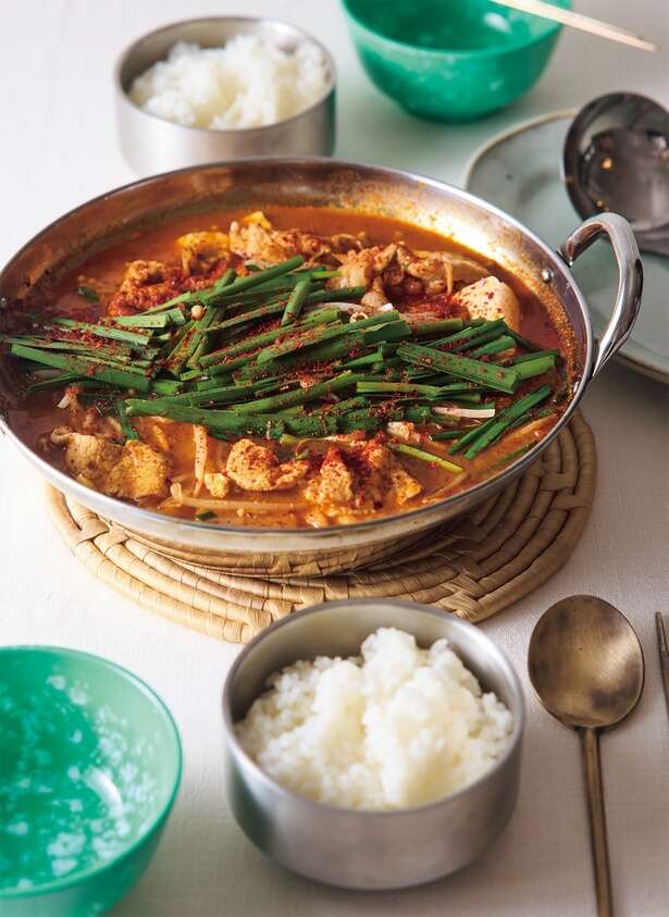 3 2の具材に火が通ったら、豚肉を広げて入れてから、すりおろしたにんにく1片分を混ぜて入れ、にらを入れて、中火でさらに煮込む。豚肉に火が通ったら火を止め、みそを溶き入れて、仕上げに甘口唐辛子(粗びき)をかける。味見をして、足りない場合はみそ(分量外)を足して完成。