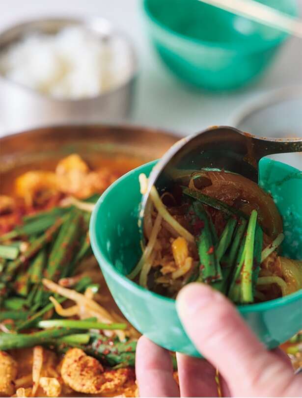 2 ごま油を熱した鍋に、薄切りにんにく、長ねぎを入れて炒める。香りが立ったら、甘口唐辛子(粉)を入れて軽く炒める。水を入れてから、いりこ、昆布を加え、にら以外の野菜、豆腐を入れ、みりん、ナンプラー、しょうゆを加えて蓋をし、中火で煮込む。
