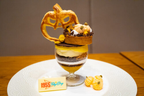 ジャック・オ・ランタン型のパイが印象的なサンデー。チョコを割って、アイス、チョコクランチ、パンプキンプリンと、次々に味と食感が変わっていく楽しいサンデーです。スパイスが効いた味付けで大人も飽きずに楽しめる味わい。パイには少し塩気があり、サンデーにつけるのもおすすめです。