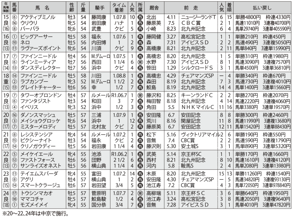 軸は①人気。4歳以上だと[7・1・0・0]。3歳が①人気に支持され、4着以下に敗れた23、24年は②人気が連対している。①人気が3歳馬ならば②人気を軸に据えたい。